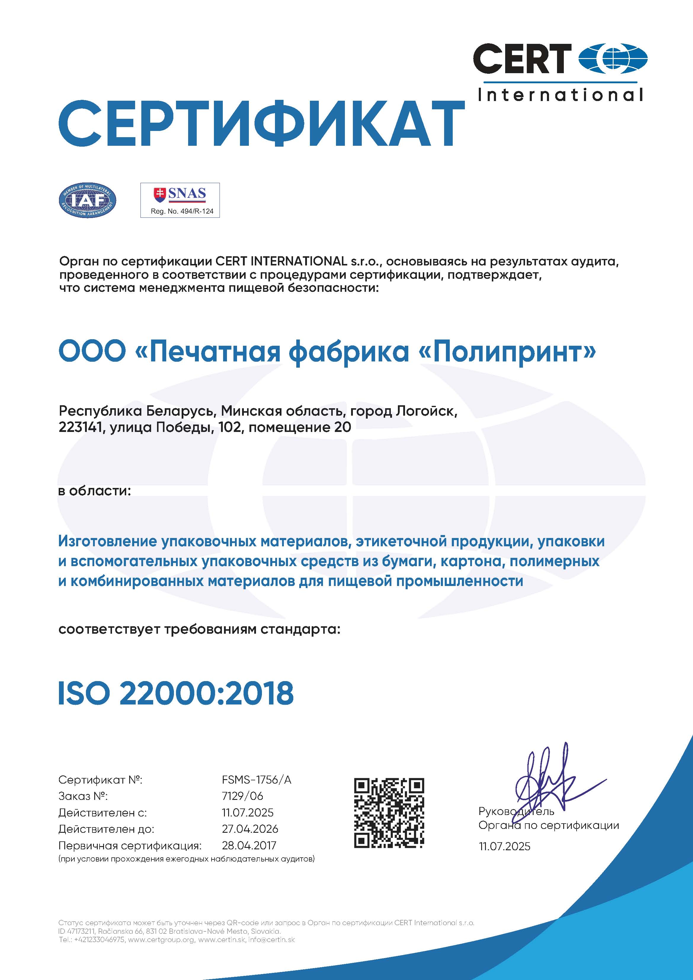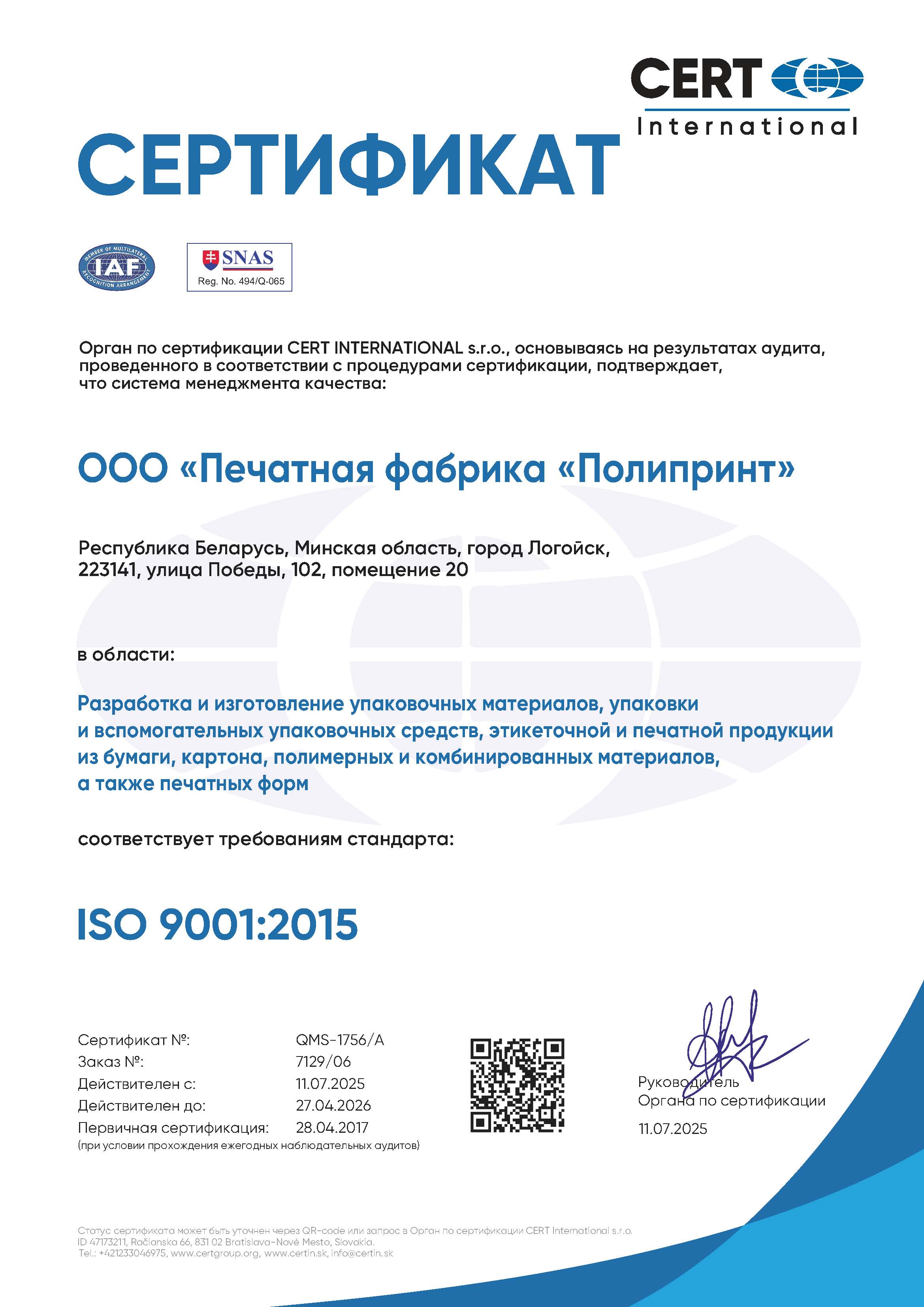 ООО «Печатная фабрика «Полипринт» обеспечивает неизменно высокое качество выпускаемой продукции благодаря пооперационному контролю на всех этапах производства, начиная с допечатных работ и заканчивая проверкой готового тиража перед отправкой клиенту. В 2008 году была внедрена система менеджмента качества выпускаемой продукции, в 2015 году проведен сертификационный аудит с расширением области действия сертификата, а в 2017 году мы вошли в число первых в Республике Беларусь предприятий, на которых был проведен интегрированный (на 3 системы) сертификационный аудит. По результатам аудита была получена высокая оценка эффективности мер по совершенствованию и обеспечению уровня качества и безопасности продукции, а также охраны здоровья и безопасности труда, что гарантирует выполнение требований потребителей в полном объеме, в установленные сроки и в соответствии с договорными обязательствами, ТНПА и законодательством Республики Беларусь. В 2021 году была сертифицирована система экологического менеджмента, направленная на соблюдение требований природоохранного законодательства и снижение негативного воздействия деятельности предприятия на окружающую среду.